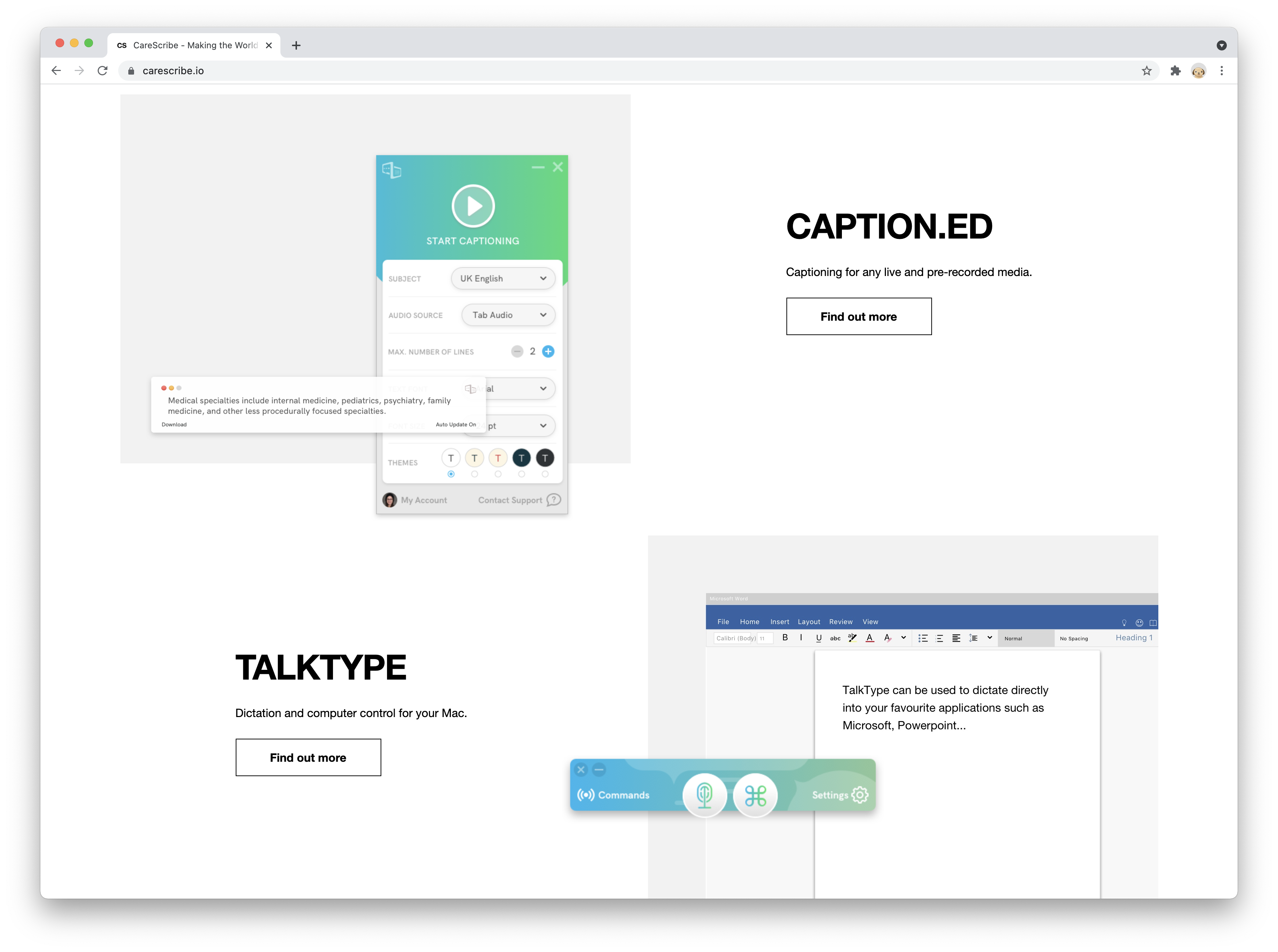 I built the Carescribe suite of native OSX text-to-speech accessibility apps, including Caption.ED and TalkType. They are deployed at educational institutions and businesses across the UK.