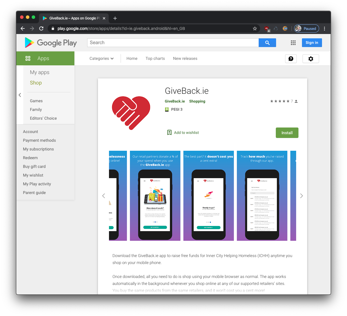 Giveback is a cross-platform app and server that provides seamless mobile charity donations. It implements a transparent HTTPS-intercept IPSEC VPN, which redirects users on mobile shopping websites, so that an affiliate link is inserted. This money is donated to charity.