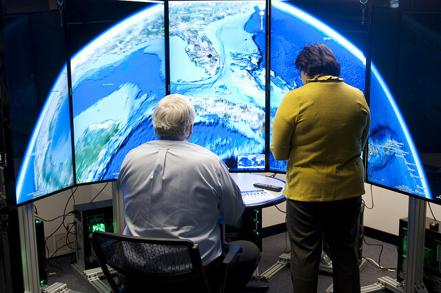 NASA uses the ClusterGL distributed/parallel rendering system I built at Johnson Space Center in Houston. ClusterGL transparently intercepts an applications OpenGL API calls and transmits the resulting command stream across a network to multiple display outputs.
