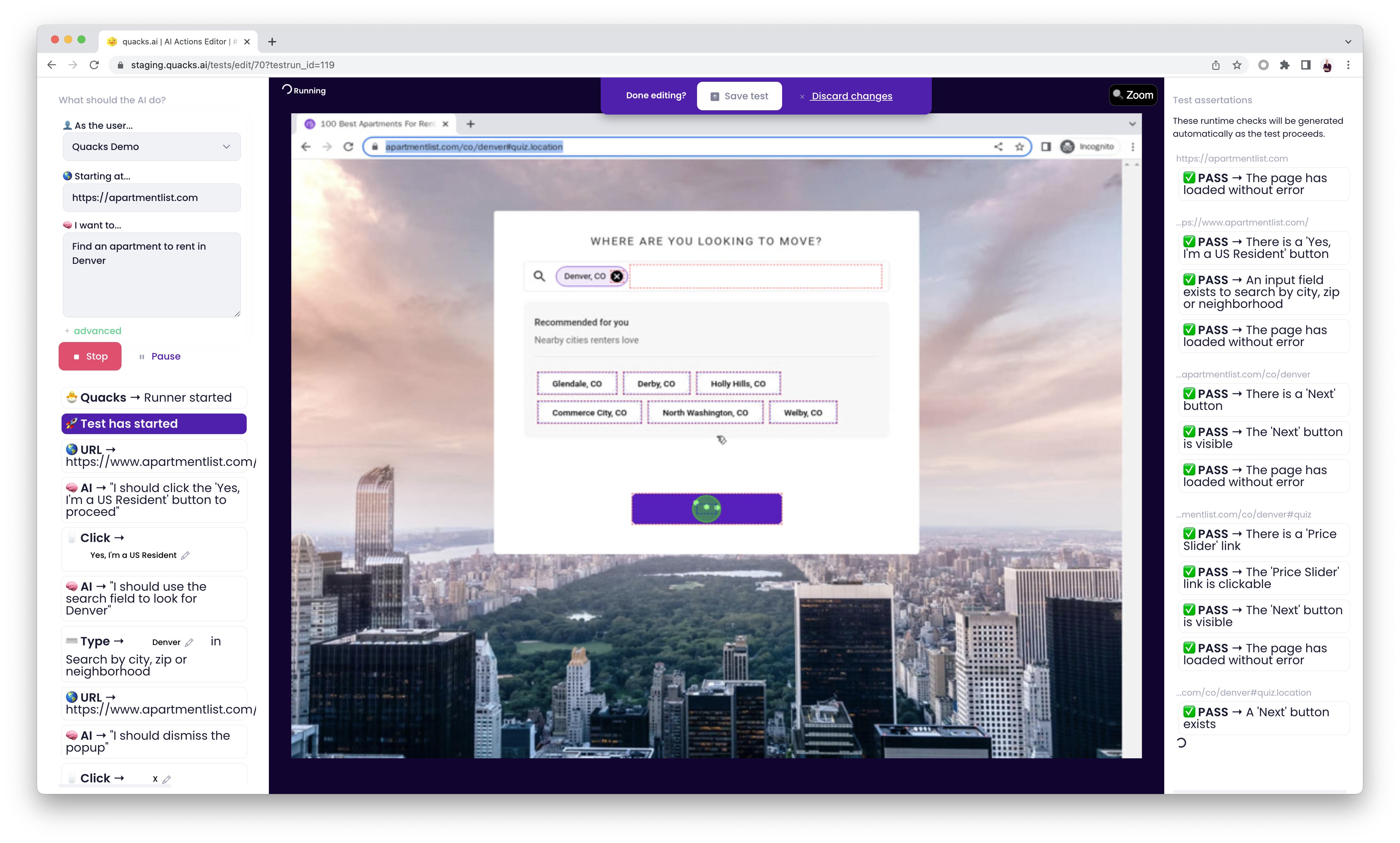 As CTO at Quacks.ai, I built this generative AI QA platform. It allowed users to create automated tests in plain english within seconds, executed by a smart browser agent. Funded by Antler.