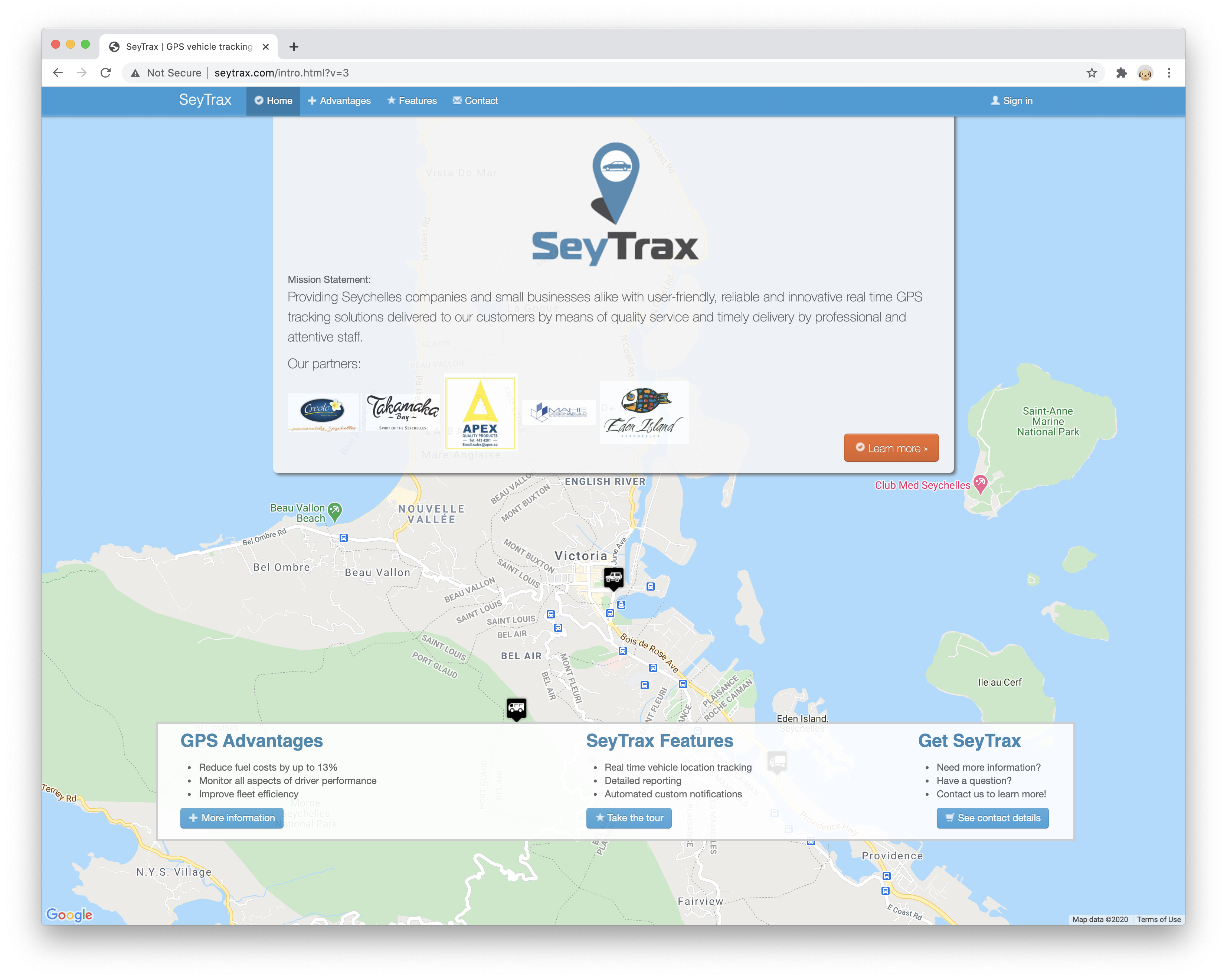 I built the GPS fleet tracking system SeyTrax in 2012 while working in the Seychelles. It is still the most widely used GPS tracking system in the country.